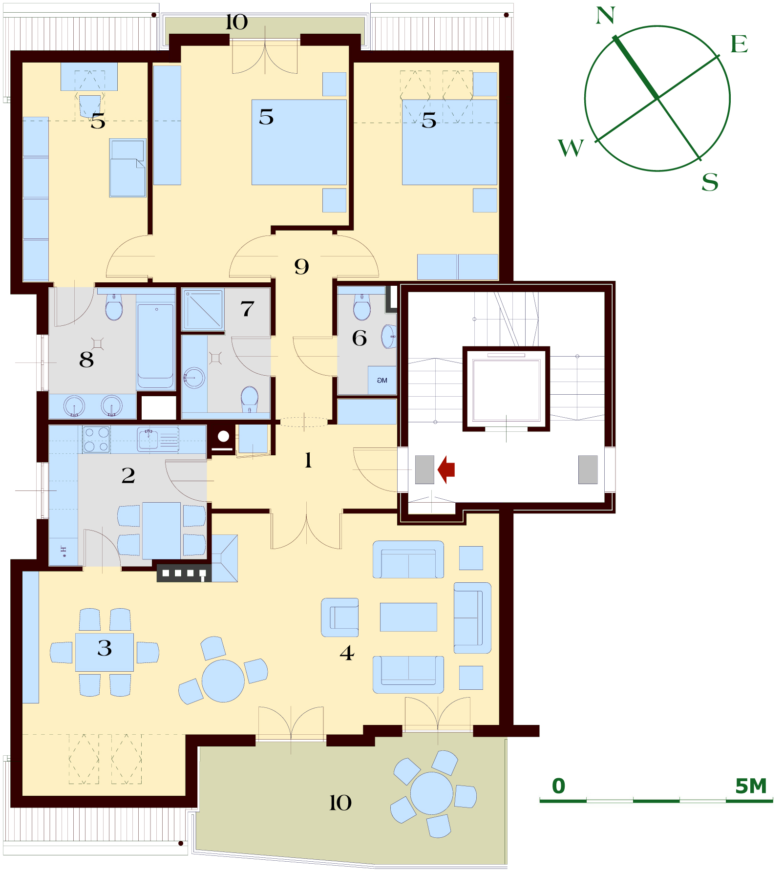 A nappali 45 m2-es, napfényes, melyhez 16 m2-es panorámás terasz csatlakozik. A konyha felszerelt, gépesített. 2 fürdőszoba van, melyhez mosókonyha is tartozik.