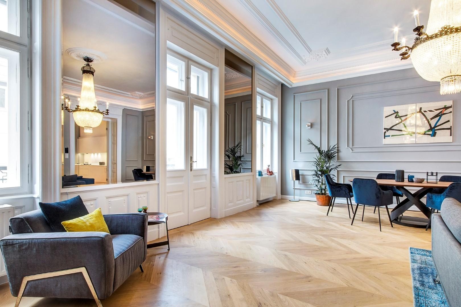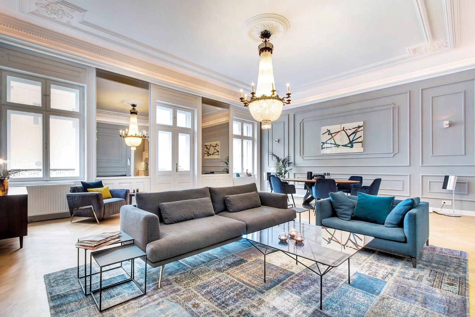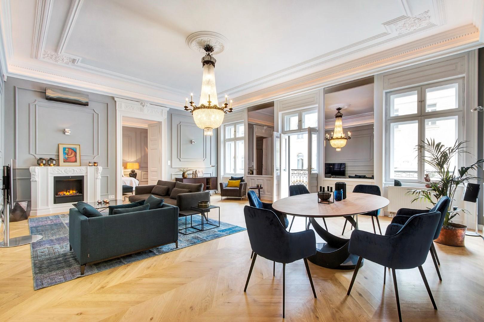 The apartment is completely refurbished to very high standards. The owners tried to maintain the elegance and the values of the original apartment. The chandelier is 100 years old and it is the shiny pearl of the living room.