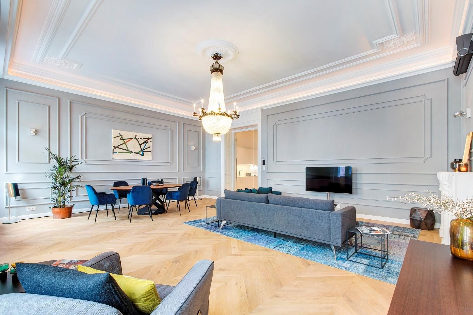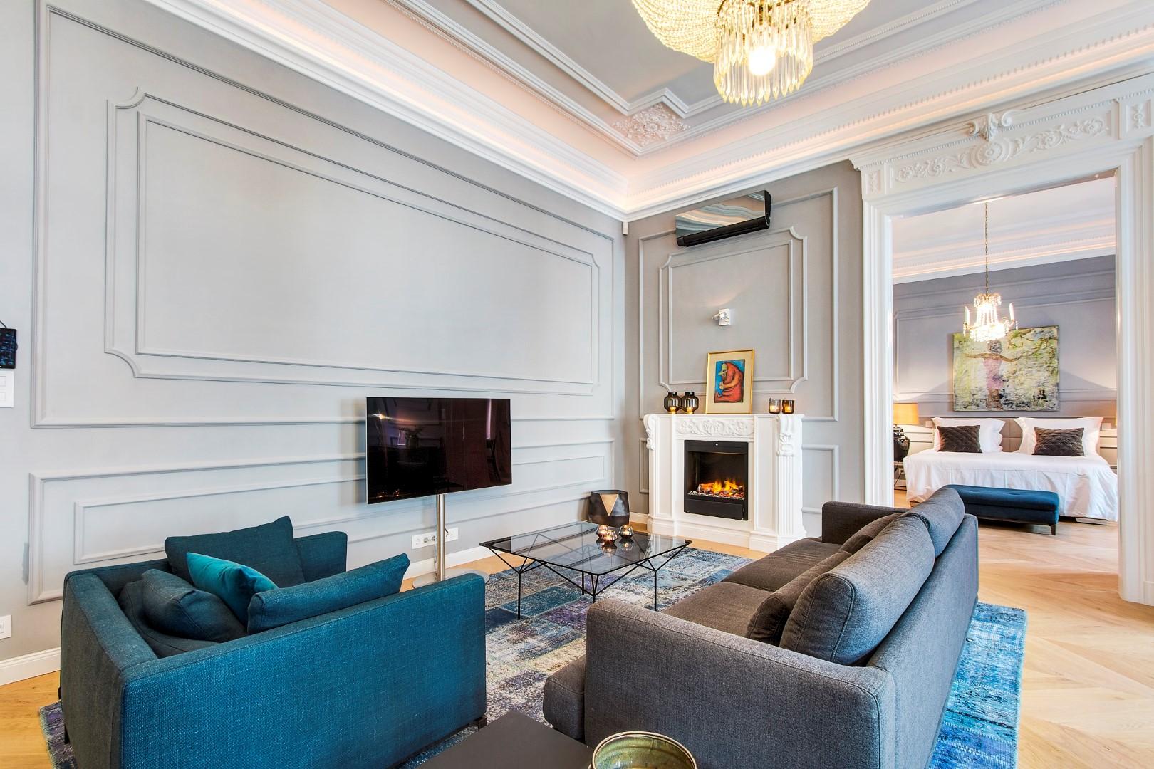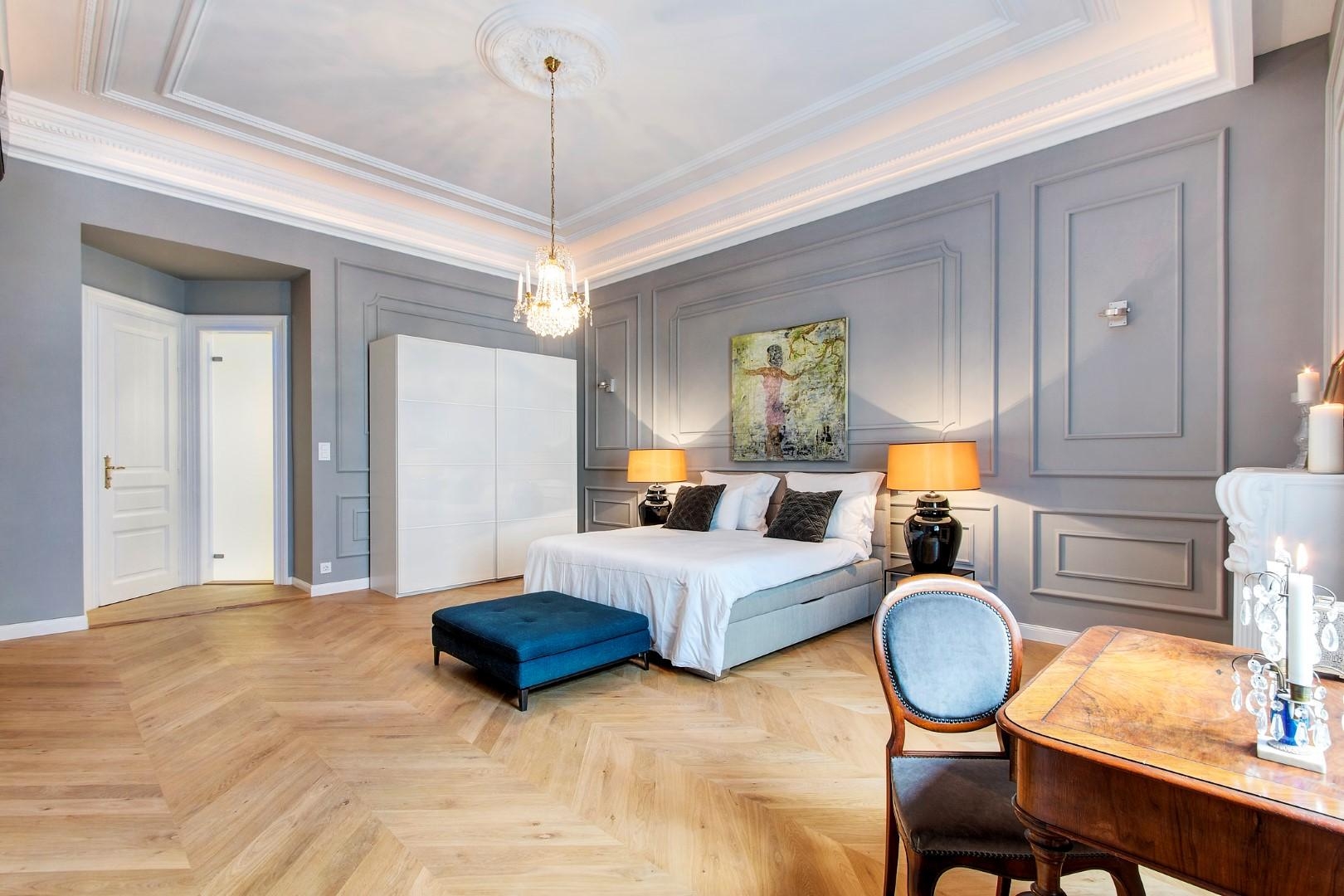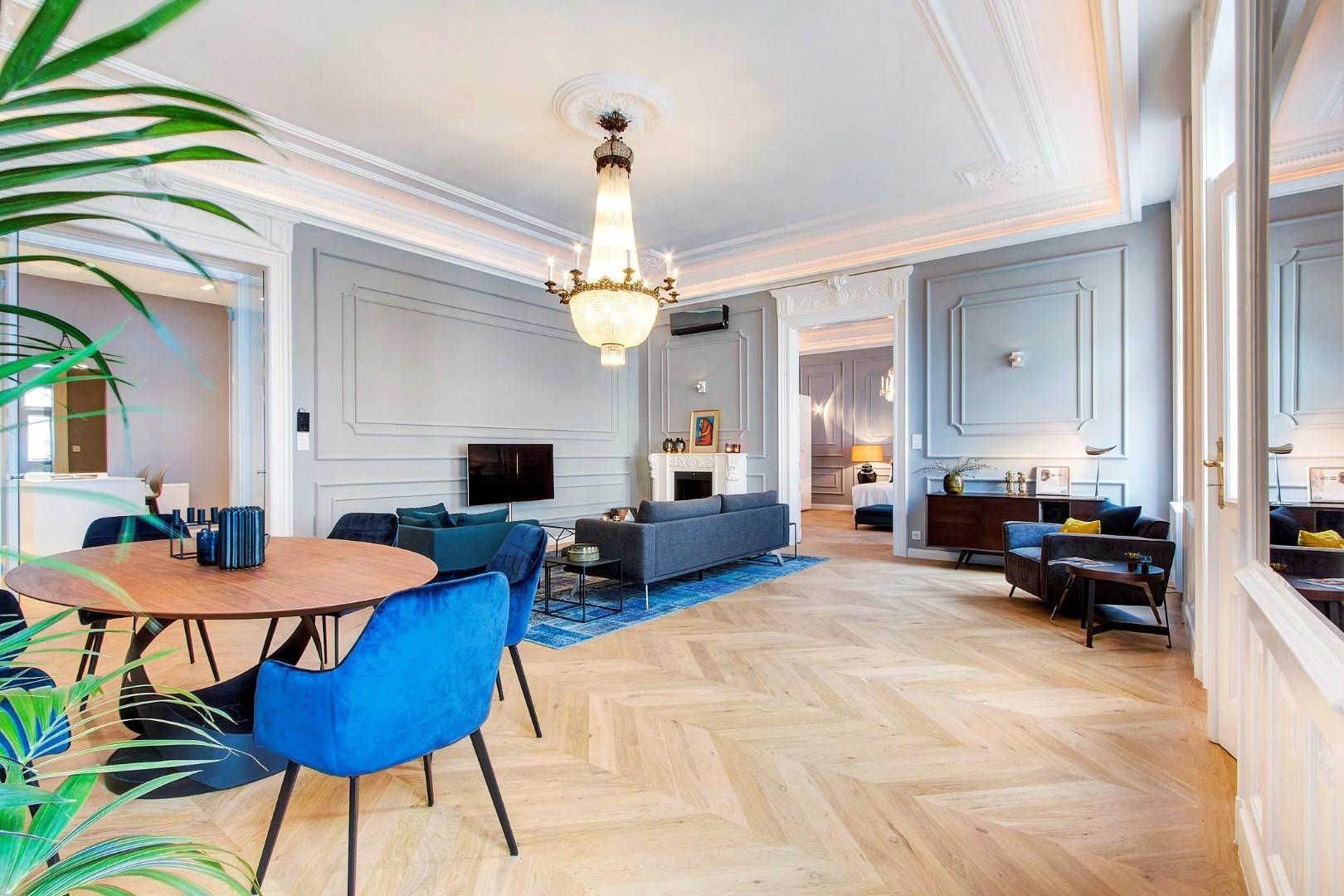 The apartment is completely refurbished to very high standards. The owners tried to maintain the elegance and the values of the original apartment. The chandelier is 100 years old and it is the shiny pearl of the living room.