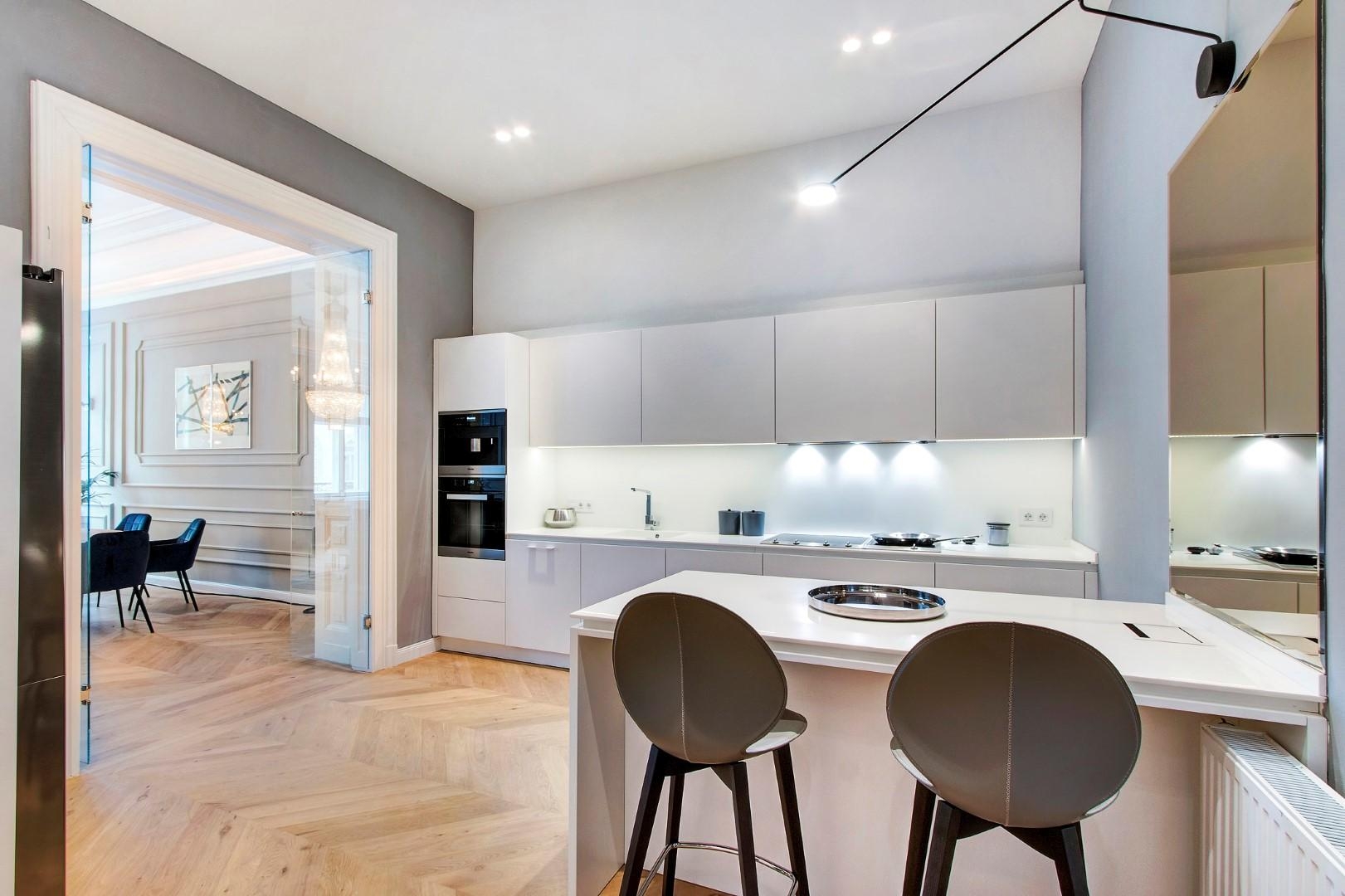 The property is located on the 3rd floor in a beautifully renovated building with elevator. It has an entrance hall, living room, 2 bedrooms, 2 bathrooms with shower, kitchen and guest toilet.