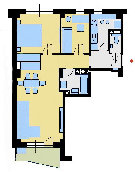 The apartment is furnished, the kitchen is equipped, the bedrooms overlook a quiet inner park.