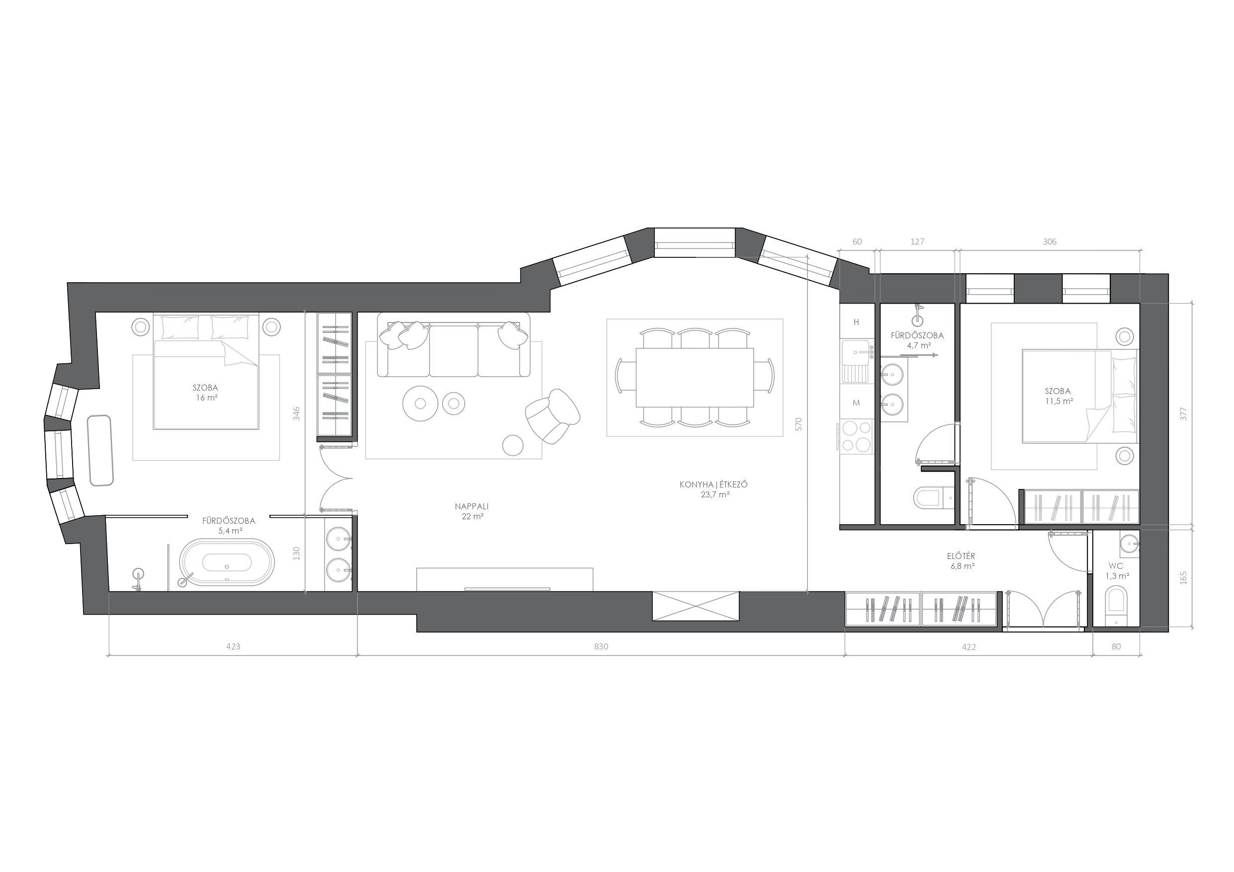 The kitchen furniture, built-in wardrobes and bathroom furniture are custom made for the apartment, all the mechanical elements (air conditioning, fireplace, kitchen appliances, gas boiler, blinds...) are new, under warranty, as are the sanitary ware and lamps.