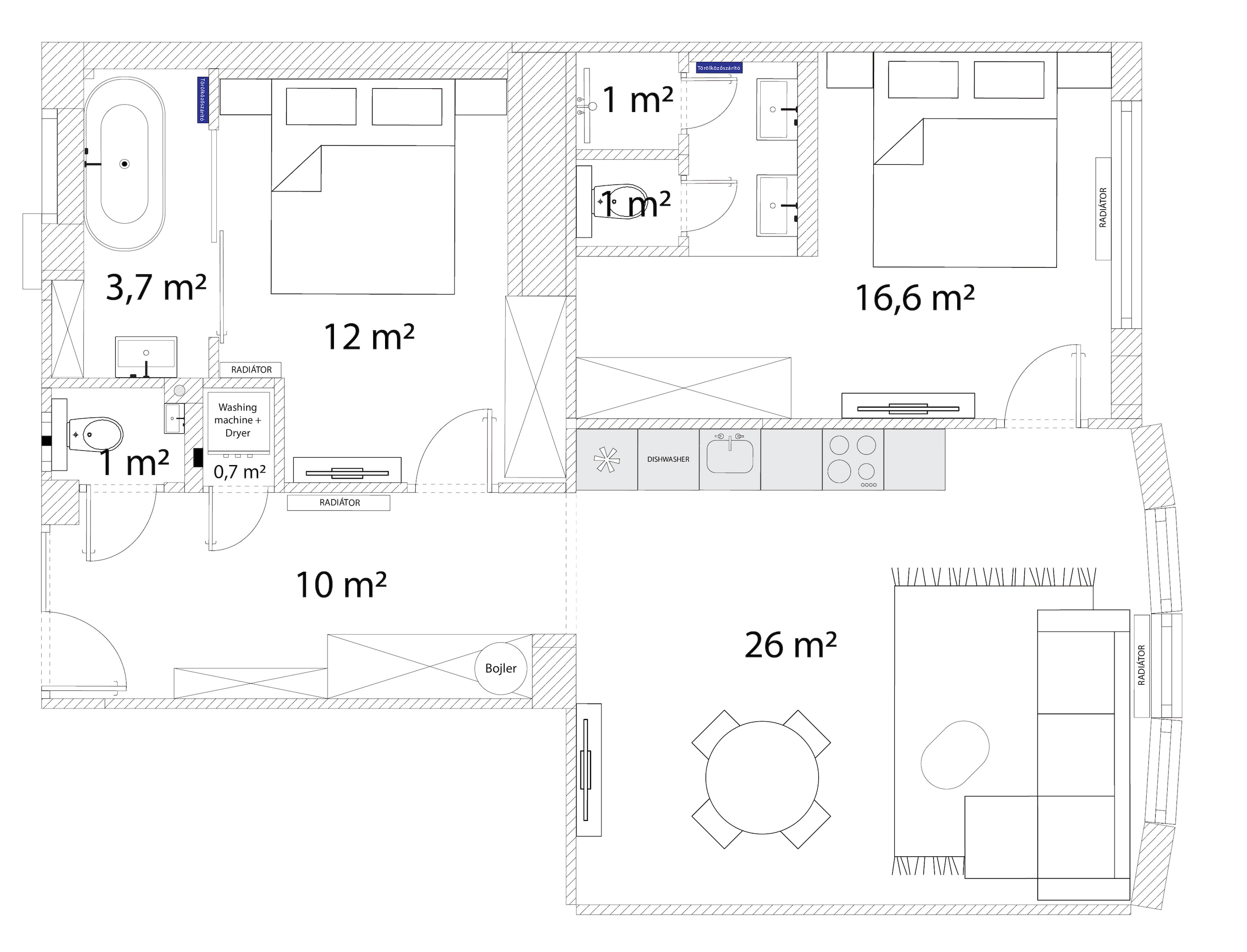 Layout: two bedrooms, two bathrooms, and a spacious open-plan living room with kitchen. Comfort is ensured by air conditioning in every room, central heating, and a boiler for hot water.