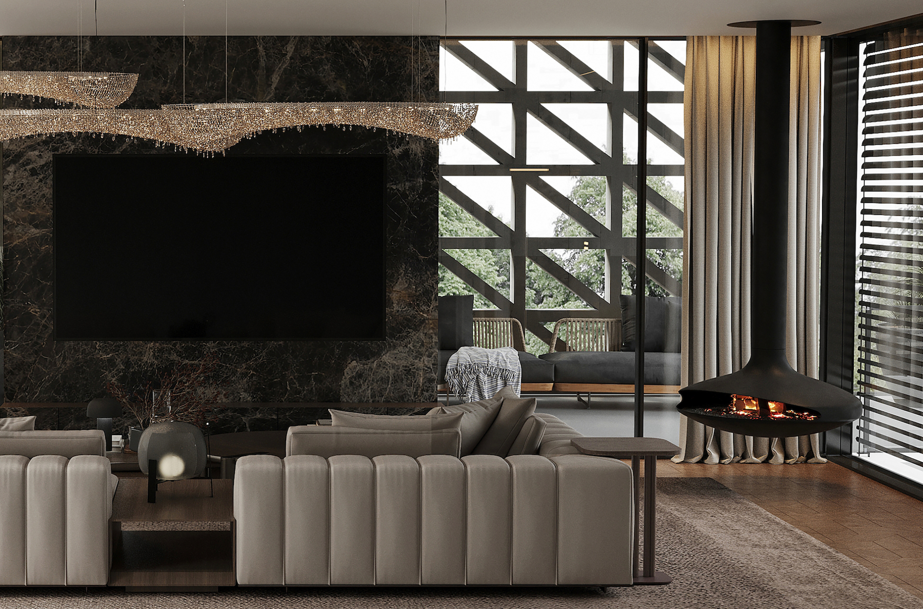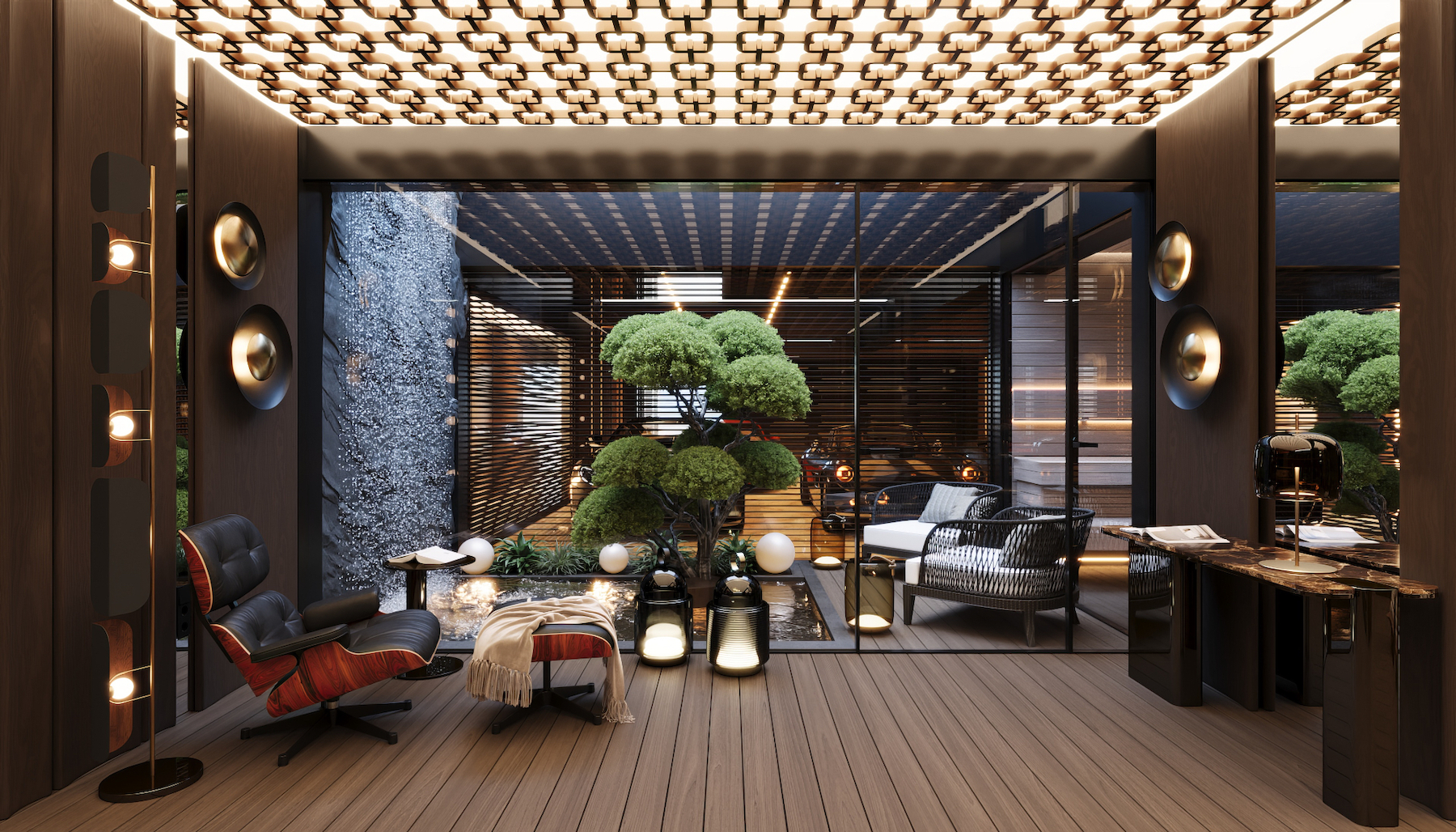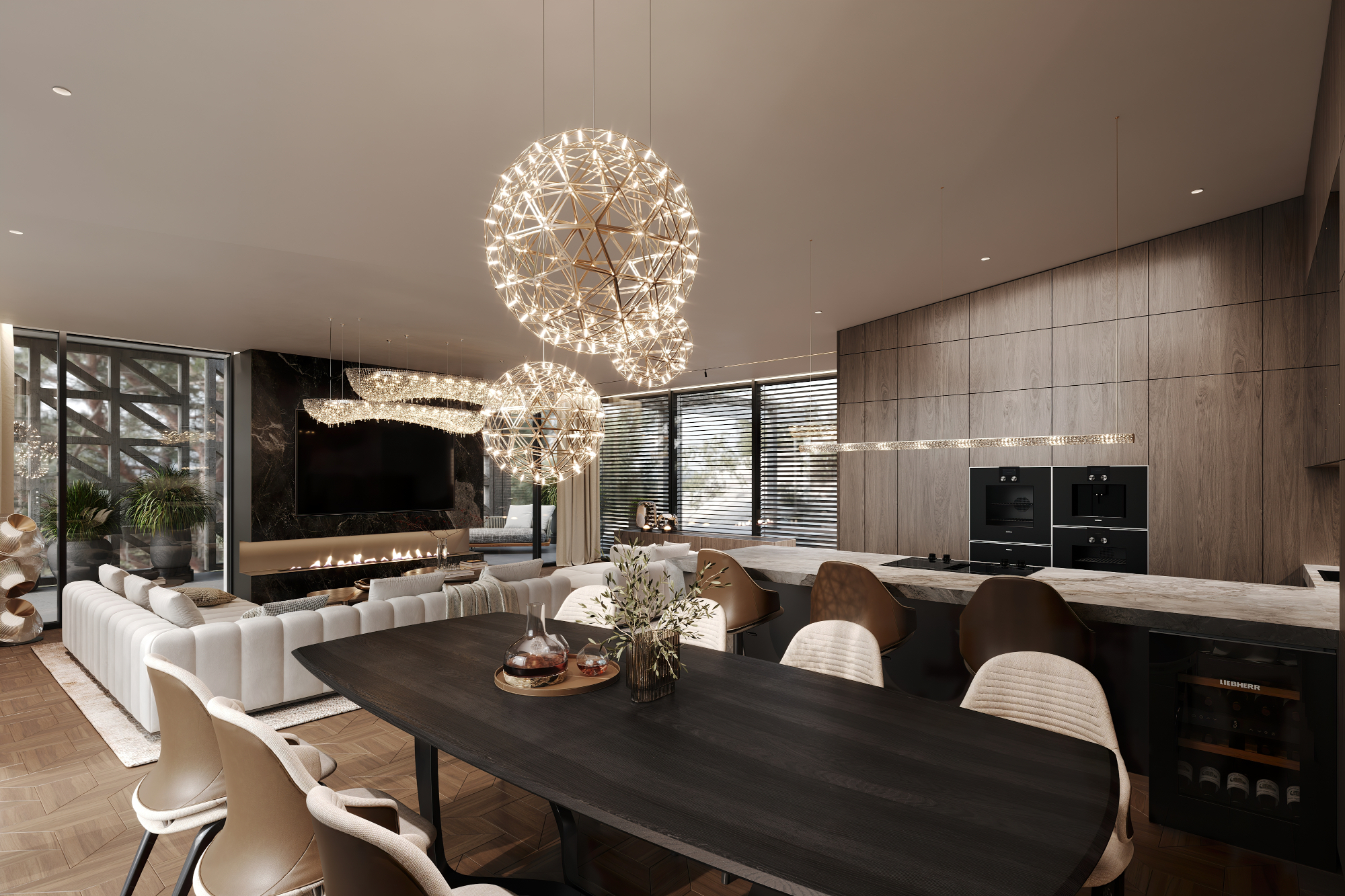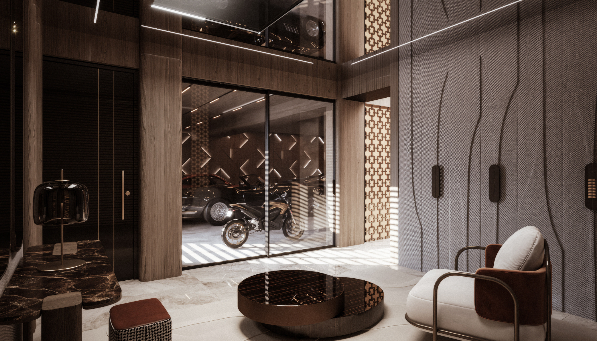 The lower ground floor features a five-car garage, a wellness and fitness area, a multifunctional wine cellar and cigar lounge, as well as an atrium-style green courtyard filled with natural daylight, creating a truly unique atmosphere.