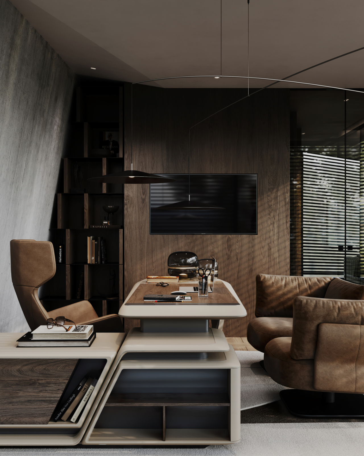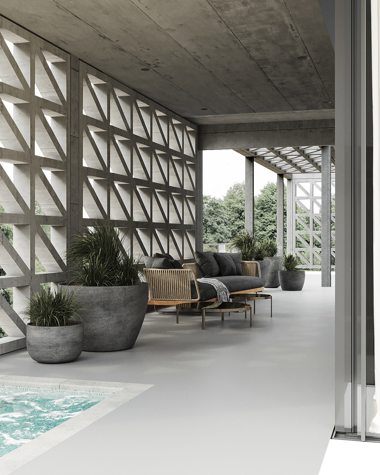 Designed in a contemporary architectural style, the villa blends harmoniously into its natural surroundings. Exposed concrete exterior elements are paired with warm, modern interior design, creating a refined and timeless aesthetic.