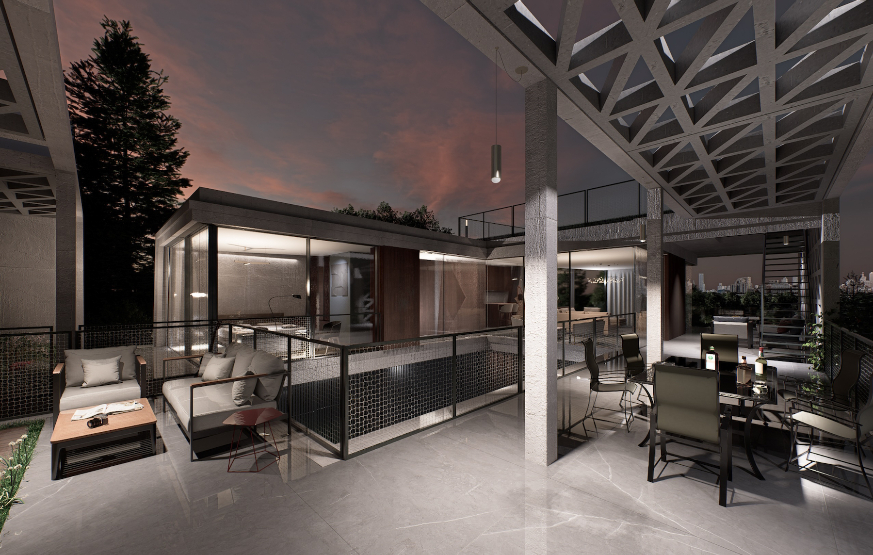The terrace is equipped with a built-in jacuzzi and a perforated pergola that allows natural light throughout the year. From here, a separate staircase leads to the green-roof rooftop terrace, offering breathtaking panoramic views of the city and the surrounding hills.