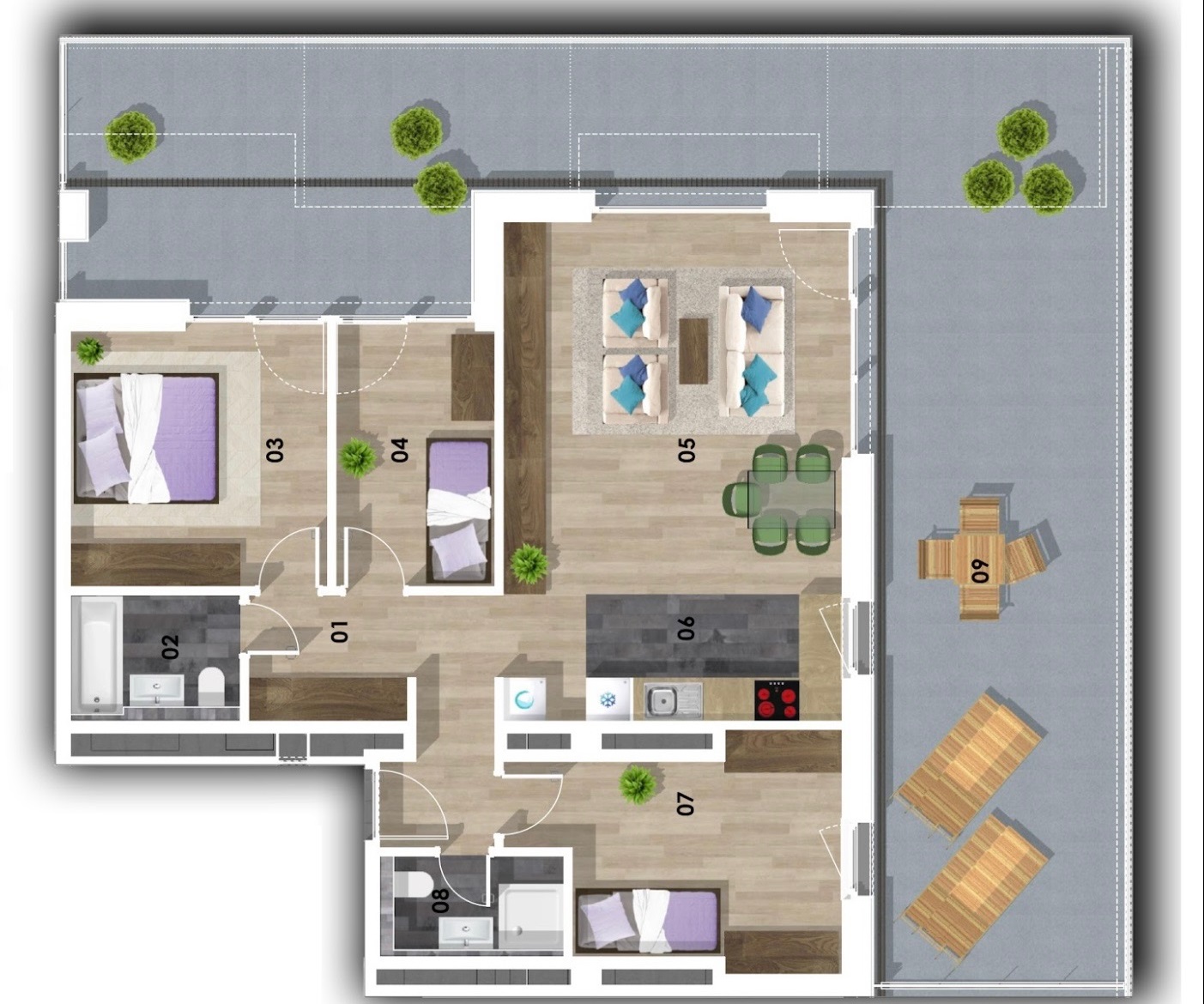 The layout of the apartment is: american kitchen style living room, 3 rooms, hall, 2 bathrooms (shower and bath), spacious terrace (78 sqm).