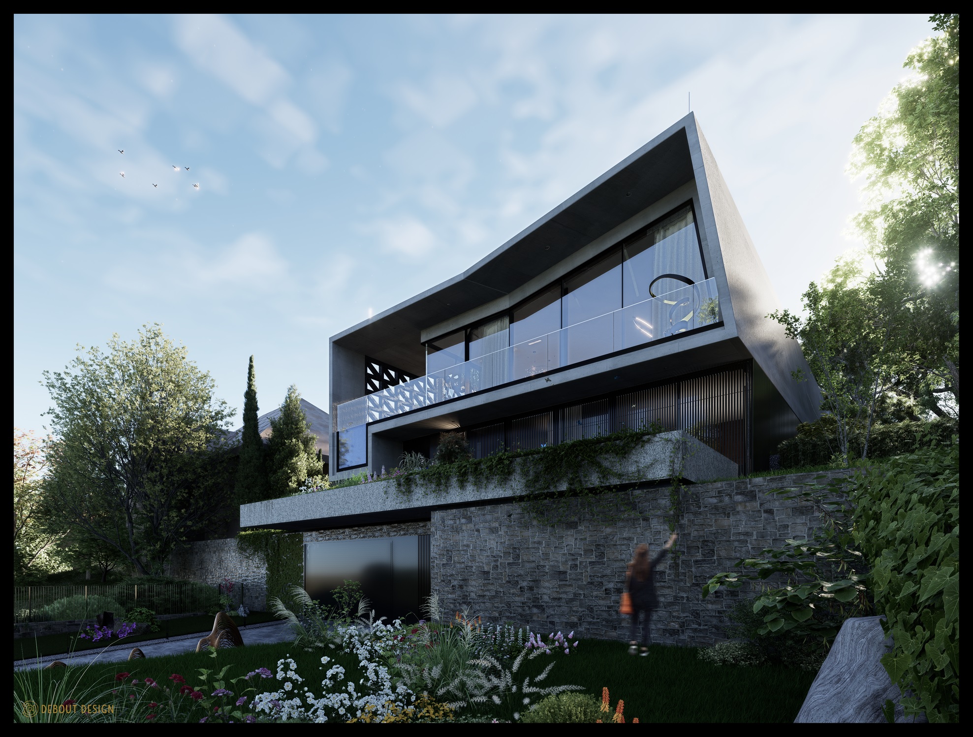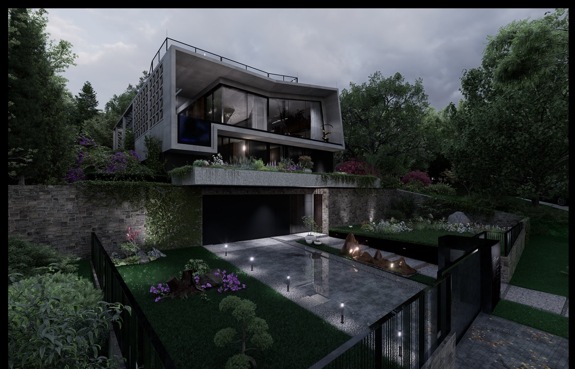 Az épület kortárs stílusban megálmodott, letisztult megjelenésű villa, amely harmonikusan illeszkedik természetes környezetéhez. A nyersbeton homlokzati elemek és a meleg tónusú, modern belsőépítészeti kialakítás időtálló, exkluzív karaktert adnak az ingatlannak.