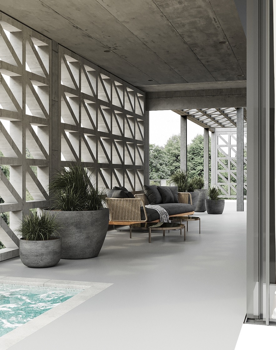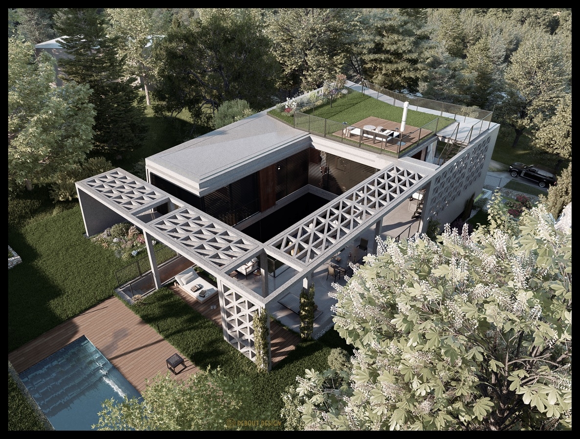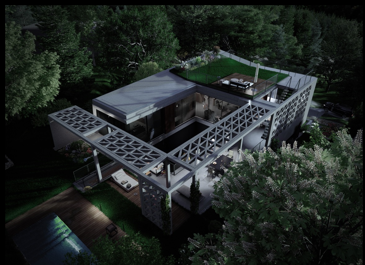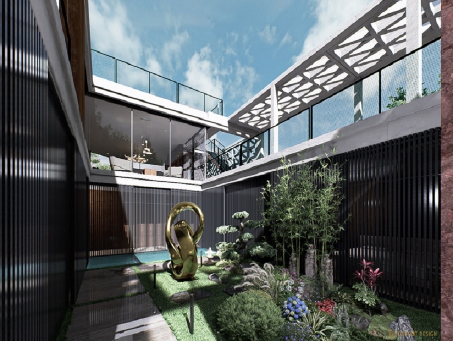 A gondosan megtervezett térszervezés a nap járását követi: az L alakú épülettömeg és a zöld belső udvar biztosítja, hogy a villa minden helyisége egész nap természetes fényben fürödjön. A belső udvar nem csupán látványelem, hanem a belső terek és a kert szerves, élő kapcsolata.