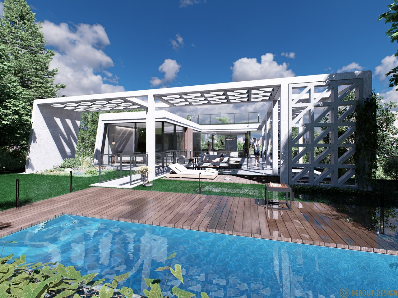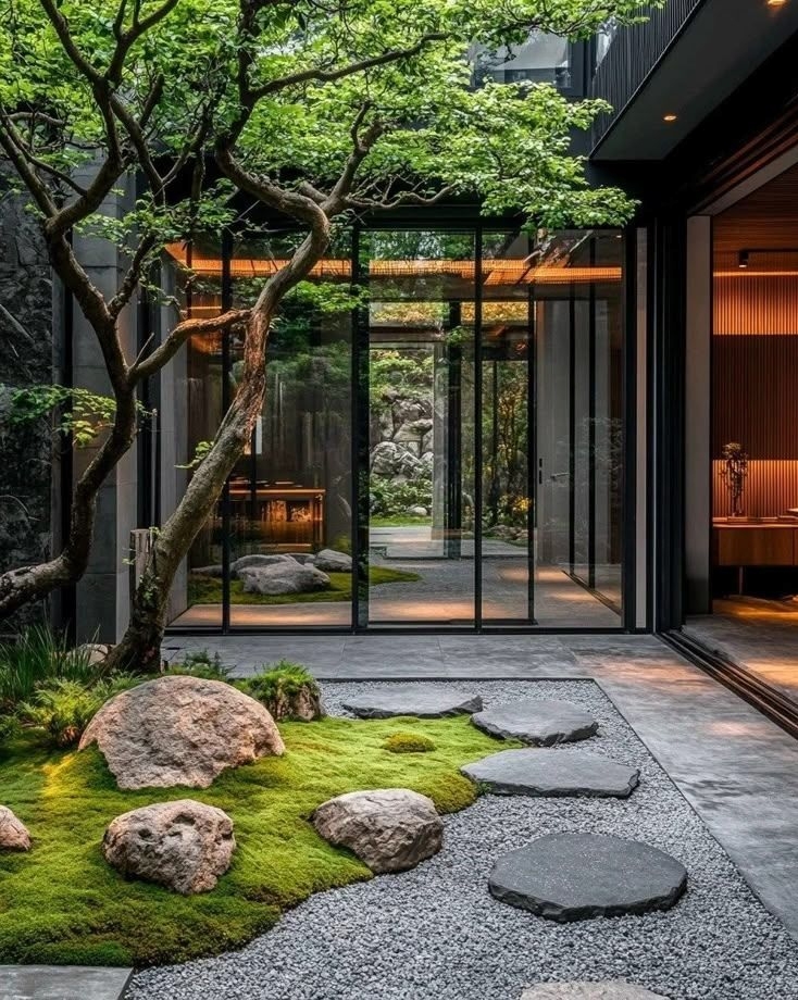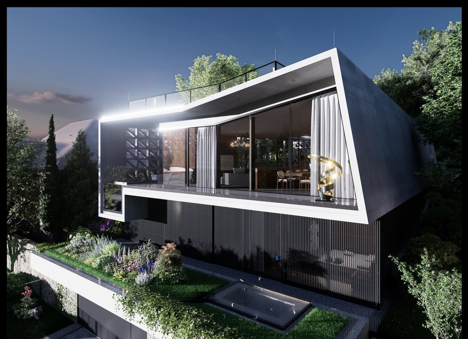 A gondosan megtervezett térszervezés a nap járását követi: az L alakú épülettömeg és a zöld belső udvar biztosítja, hogy a villa minden helyisége egész nap természetes fényben fürödjön. A belső udvar nem csupán látványelem, hanem a belső terek és a kert szerves, élő kapcsolata.