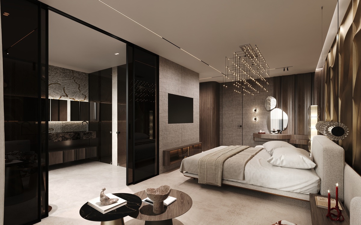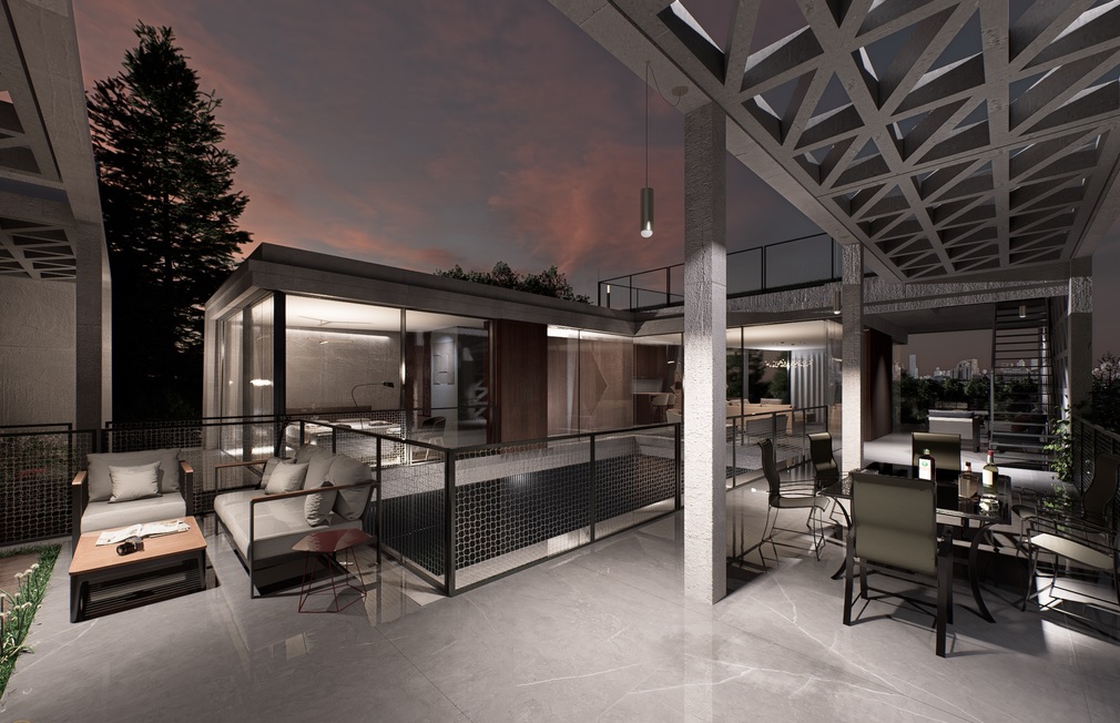 A lakótér szintjén a hálószobák egy része a csendes belső udvarra, másik része pedig teraszkapcsolattal az utca irányába tájolt. A felső szinten panorámás, egy légterű konyha–étkező–nappali tér kapott helyet, közvetlen teraszkapcsolattal.