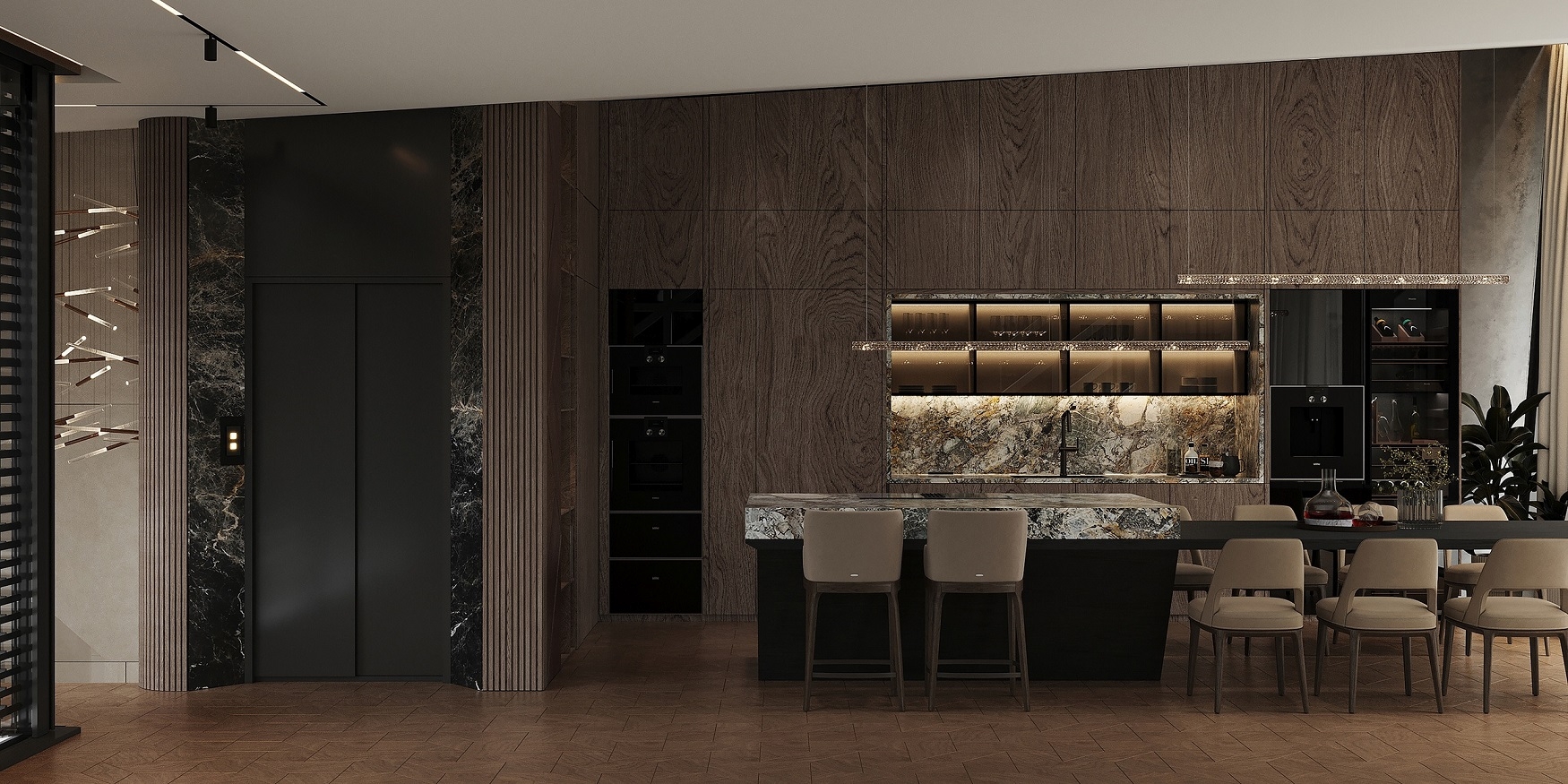 A villa többszintes kialakítású, a szintek között lift és elegáns lépcsőház biztosít kényelmes közlekedést.