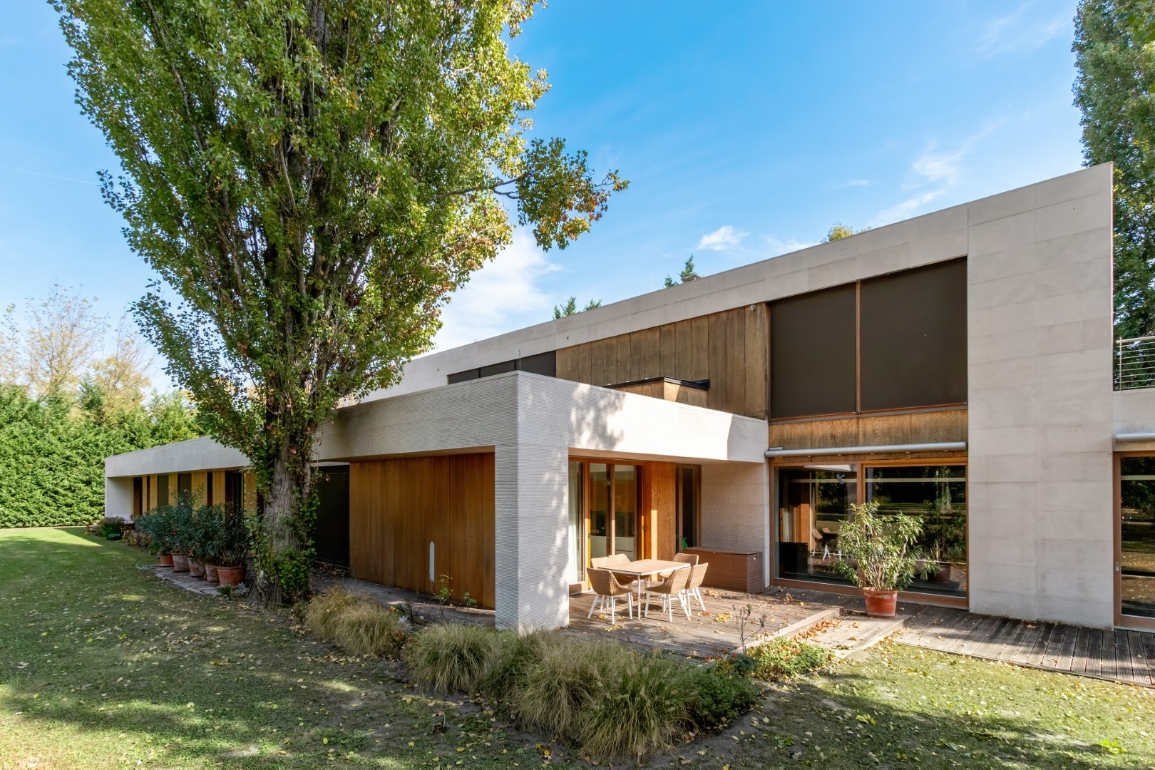 A ház különlegessége, hogy szinte minden helyiség közvetlen teraszkapcsolattal rendelkezik, így a természet közelsége minden pillanatban átélhető.