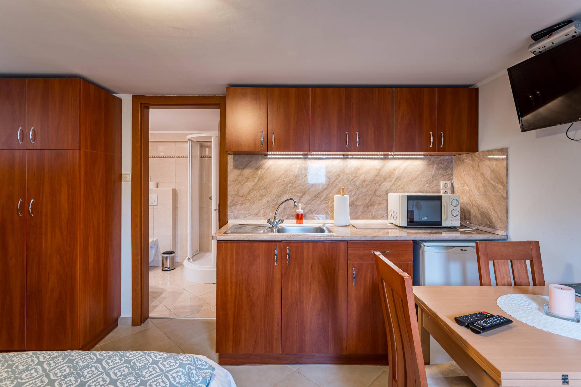 - Különálló 27 m²-es épület teljesen felszerelt konyhával, zuhanyzóval, mosdóval, tárolóval és WC-vel