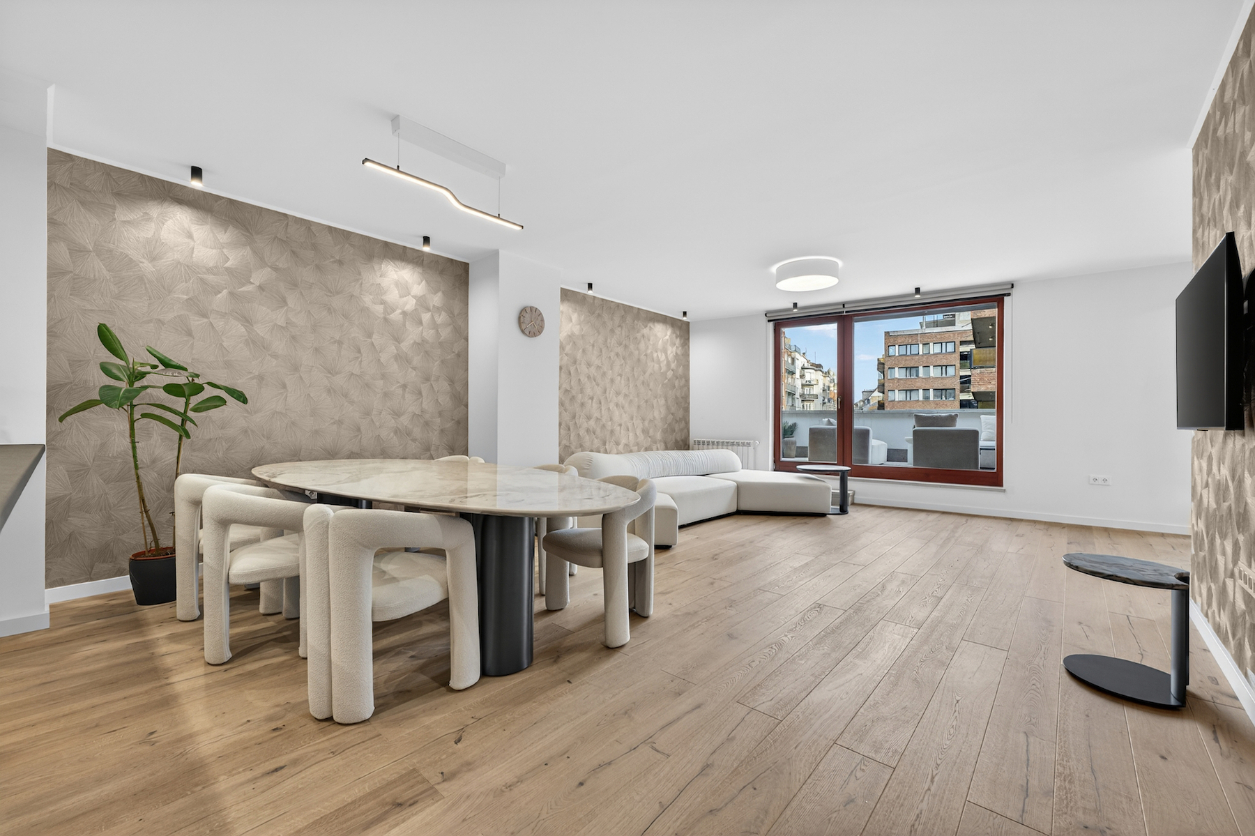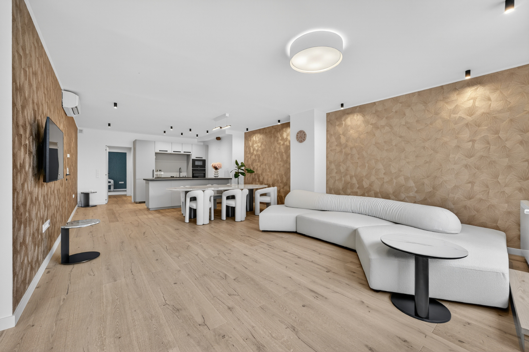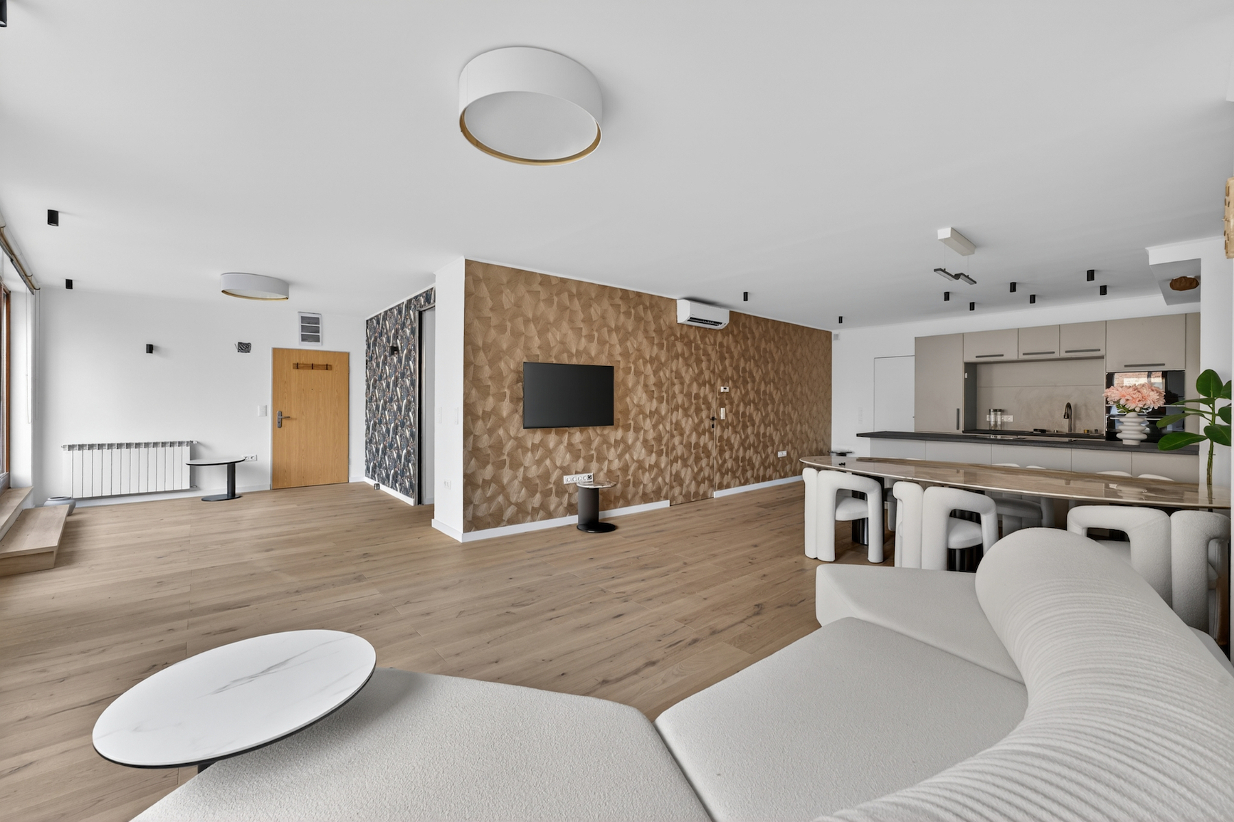 A lakás központja a világos, tágas nappali, amely egy modern, egyedi tervezésű konyhával és konyhaszigettel kapcsolódik össze: