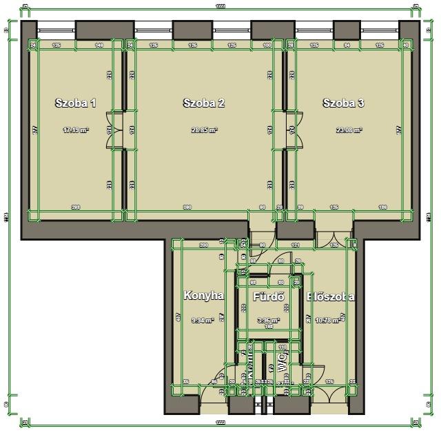 Az ingatlan tulajdoni lap szerint 100m2-es, valóságban 102,5 m2 mely jelenleg 2 hálószobából, 1 nappaliból, fürdőszobából, konyhából, kamrából, előszobából és vendég mosdóból áll. Remek az elosztása emiatt könnyen 2 háló-2 fürdőszobássá lehet alakítani.