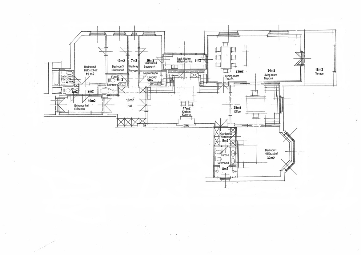Nappalija egy 18nm-es ōsfákkal körbe ölelt teraszban folytatódik, ami tavasztól késő őszig csodás kültéri életteret kínál a lakók számára. Továbbá négy (háló)szoba, három fürdőszoba, kádas és épített kettő csaptelepes tusolós, egy vendég mosdó, mosókonyha, 10 nm-es gardrób szoba, teszik kényelmessé az ingatlant. A csatolt alaprajzon látható az ingatlan felosztása, a hálószobák kellemesen el vannak választva a lakás erkélyes nappali részétől, ahol fa tüzelésű kandalló is található. A reprezentatív konyha mögött egy személyzeti konyha található, ami kiváló összejövetelekre, vacsorákra, nagyobb társasági életre is. Az étkezőben egy találó található, ami Kiscelli múzeumban kiállítási darab volt.