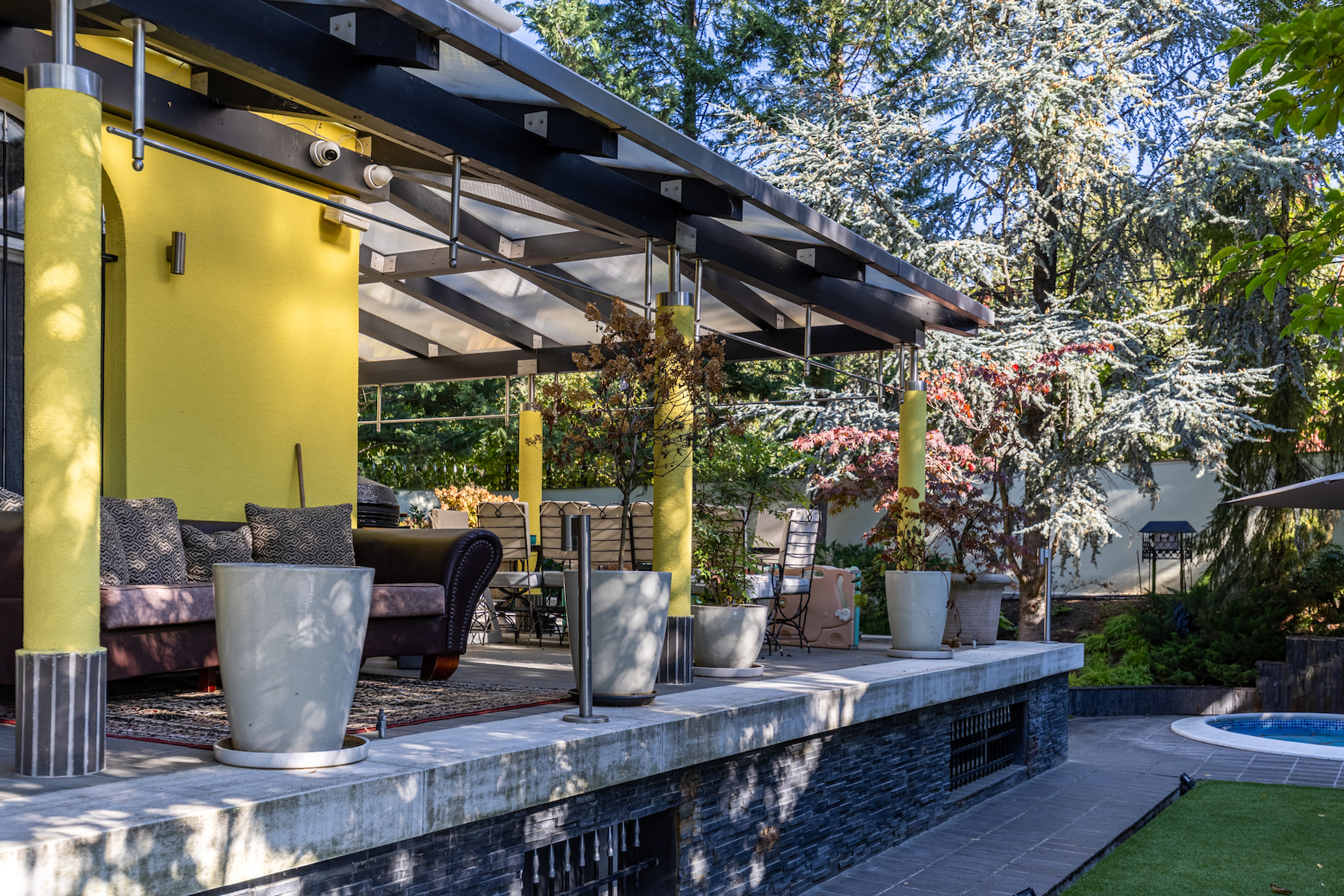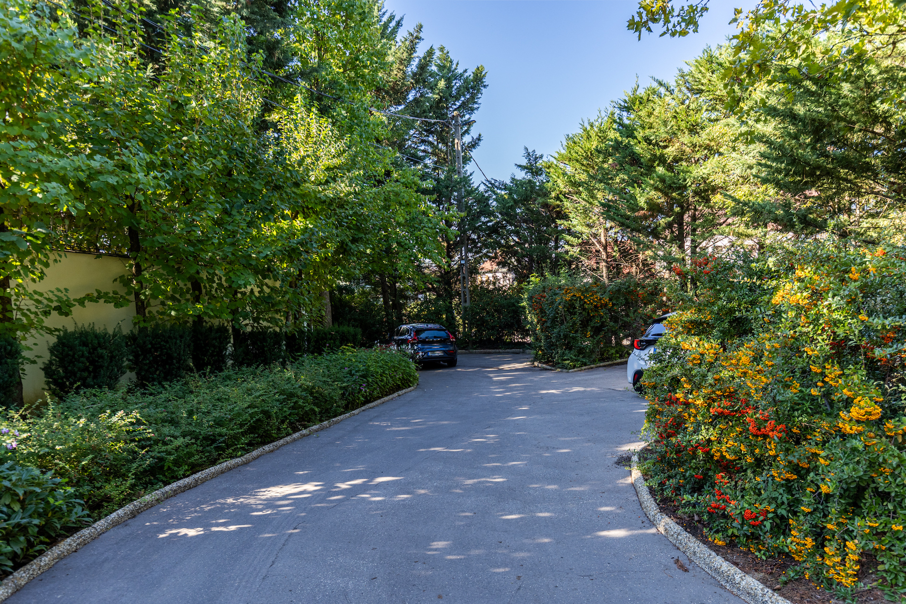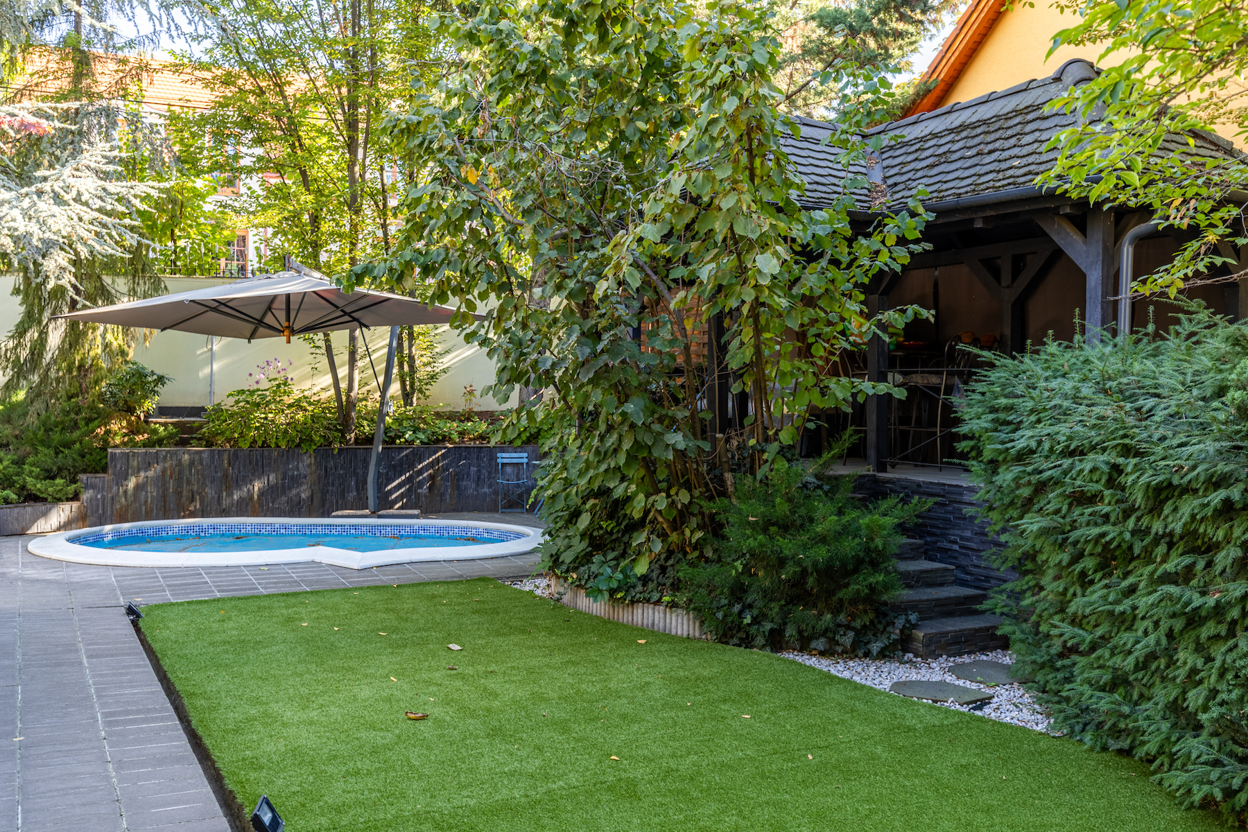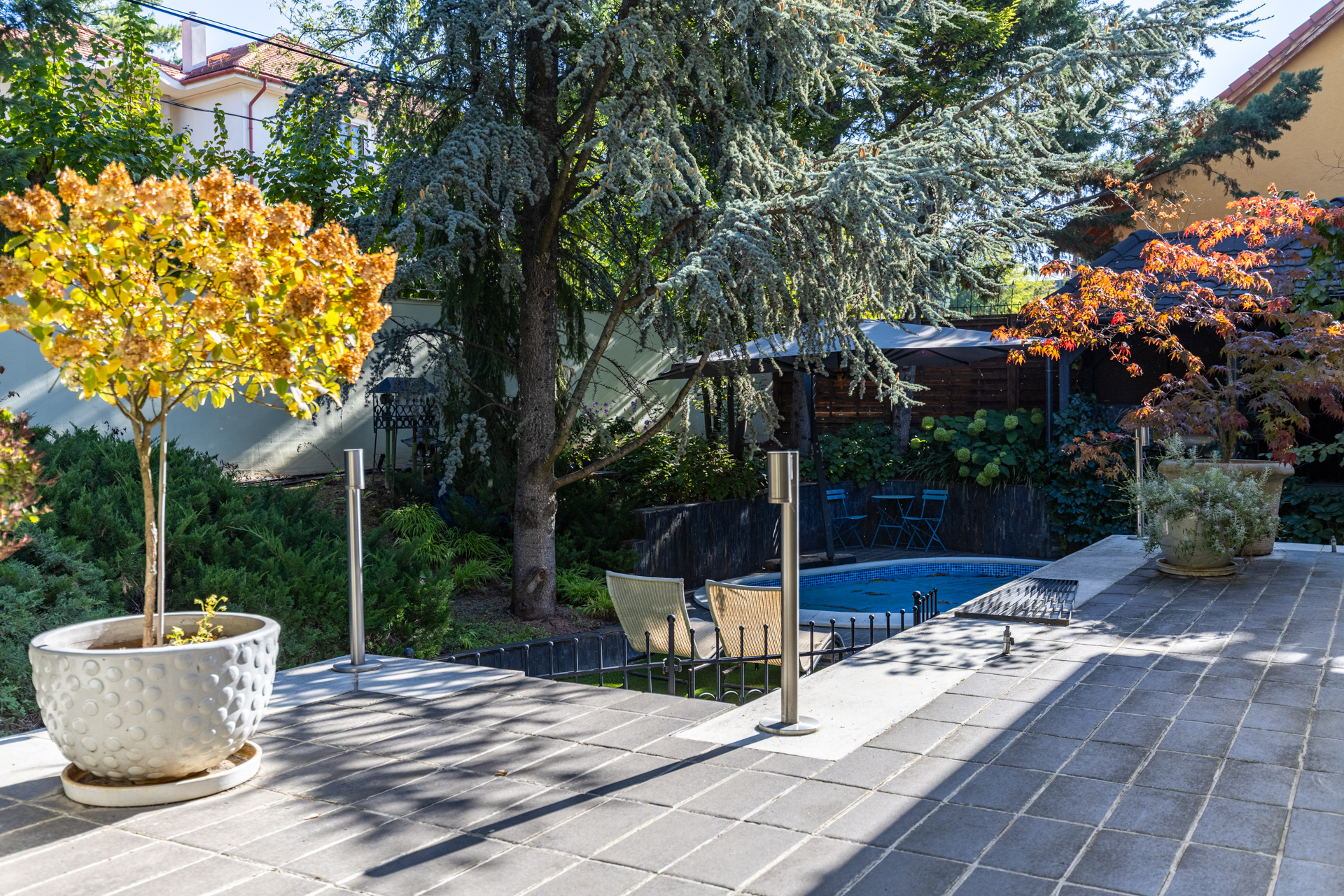 A 757 m²-es, gondosan karbantartott kert fákkal övezett, zöld oázist kínál teljes diszkrécióban.