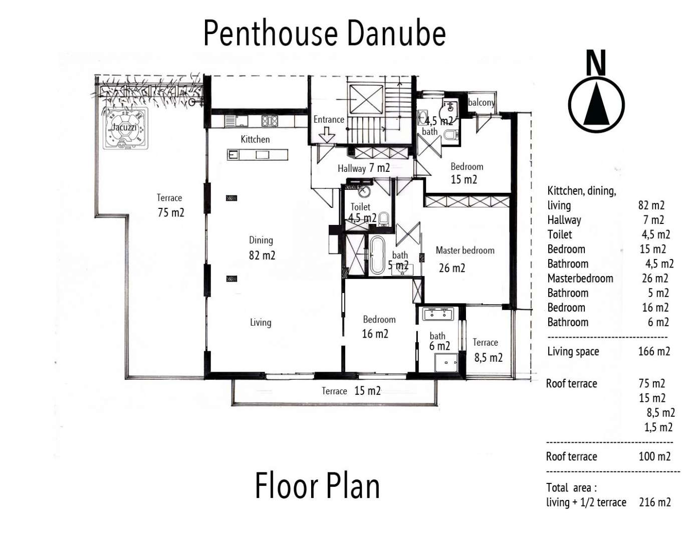 Elosztása: 82 nm nappali kandallóval, nyitott konyha, 3 külön bejáratú szoba, 3 fürdőszoba, 75nm + 15 nm + 9 nm terasz + erkély. Részben bútorozva, beépített szekrények, riasztó, légkondi, motoros redőnyök és függönyök, szél érzékelős napellenzők, "x"m es jacuzzi.