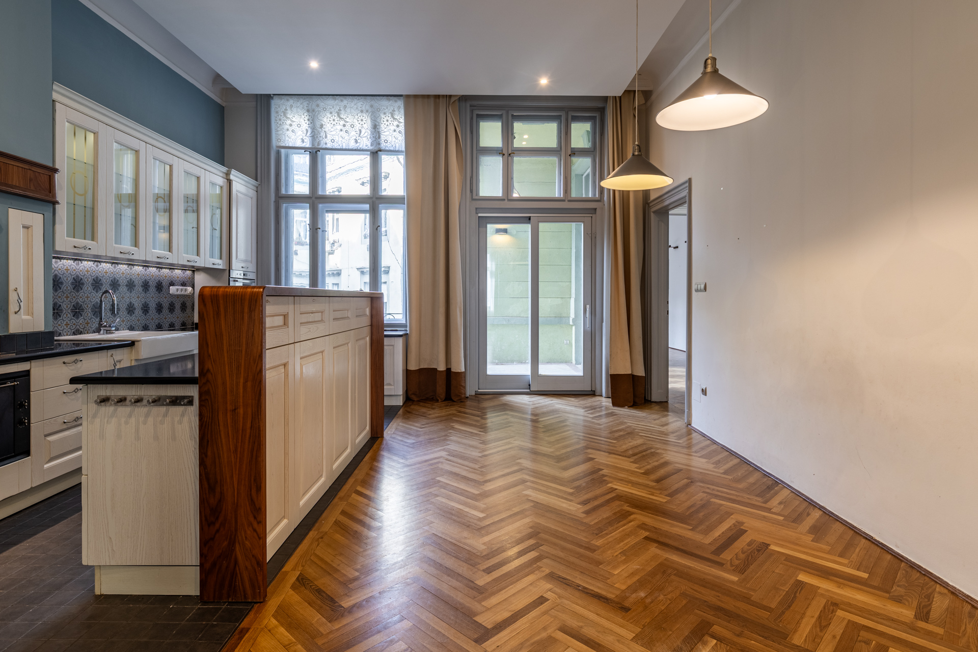 A bruttó 203 m²-es lakás nagy belmagasságának és hatalmas ablakainak köszönhetően kifejezetten napfényes és elegáns térérzetet biztosít. Az erkély tovább növeli a komfortot és a térélményt.